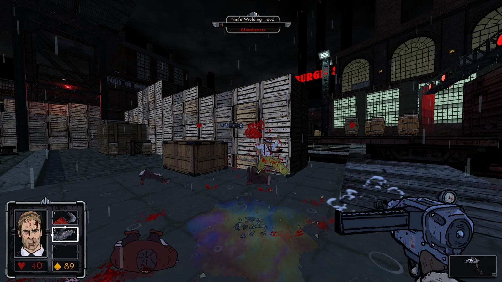 В этой скрытой области меня встречает моя первая встреча — гвоздезабивной пистолет, идеально подходящий для стрельбы по кнопке, которая открывает для меня док-офис. Какое открытие, восклицает игра! Хотя это кажется необычным, я не могу отрицать своего удовлетворения от похлопывания по голове. Впоследствии я замечаю некоторых головорезов. К сожалению, уничтожение их скрытными выстрелами в голову из гвоздестрельного пистолета не уничтожает их мгновенно, но они быстро поддаются. Мой персонаж дразнит: «Теперь ты не такой грозный, не так ли?» что забавно, хотя и не так занимательно, как «В чем дело? Недостаточно прочно для моих ногтей?» или даже культовое «Получил сообщение? О гвоздях? Из моего гвоздодера?» Тем не менее, я не могу ожидать совершенства.