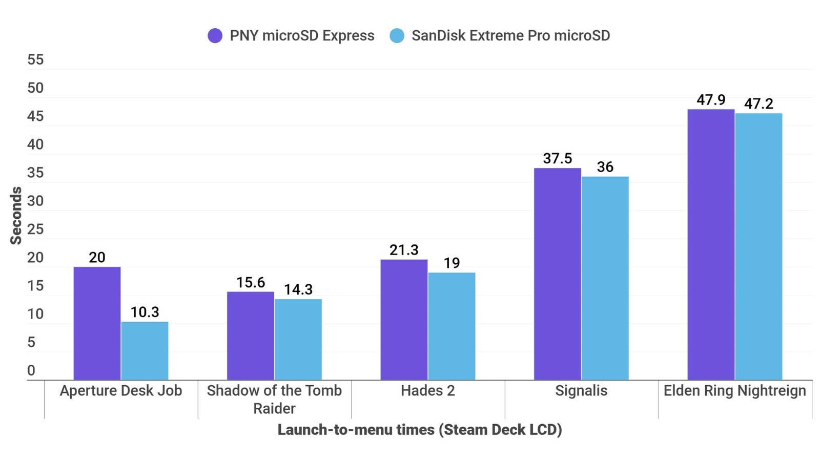 Даже несмотря на ожидаемый результат, я не мог избавиться от любопытства о том, что произойдет при использовании одной из современных карт памяти в портативном устройстве без Switch 2. Для удовлетворения своего интереса я приобрел недавно выпущенную microSD Express карту PNY объемом 256 ГБ и установил ее в слот UHS-I оригинального LCD Steam Deck. В прямом сравнении с самой быстрой картой microSD, которую мы тестировали на RPPS — SanDisk Extreme Pro, были проведены ряд тестов скорости загрузки игр. Результаты могут вас удивить, если только вы не знакомы с основами хранения данных на ПК; в таком случае они покажутся вам ожидаемыми.