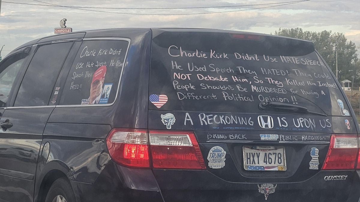 На заднем стекле автомобиля было отображено сообщение от владельца относительно убийства сторонника MAGA, и оно содержало некоторые резкие высказывания. Водитель написал: «Charlie Kirk не использовал язык вражды; он использовал речь, которую они ненавидели», и та же фраза была видна и на боковом окне со стороны пассажира.