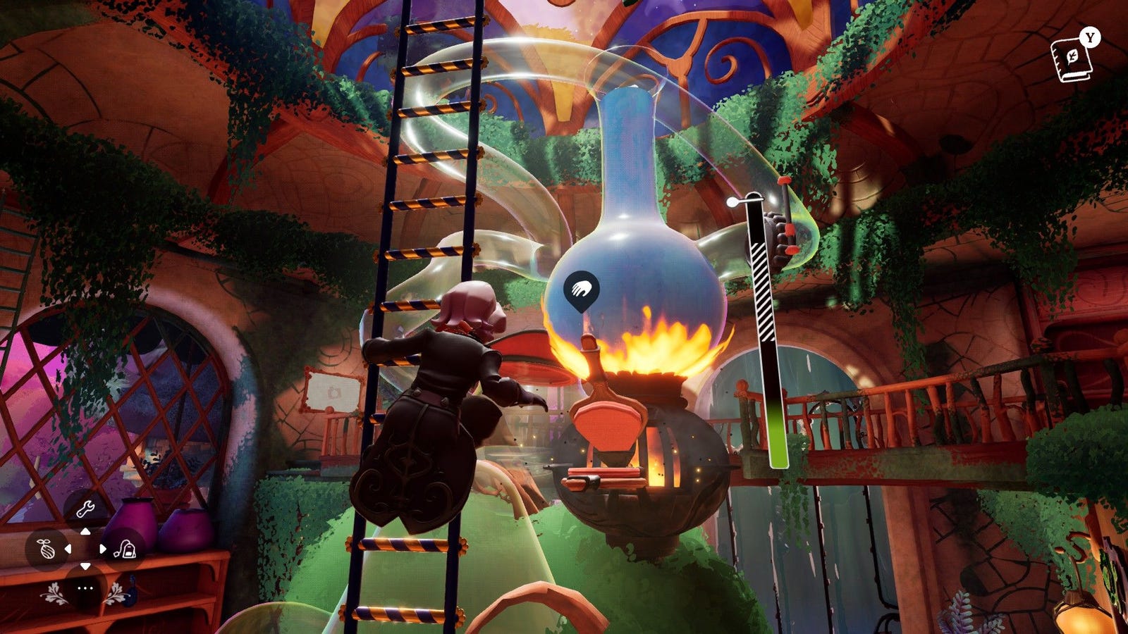В этой обстановке вы высушите чайные листья в коробке, оснащенной таймером, и соберите сформированные чайные шарики. После этого вы поднимаетесь в большой центральный инфузионный аппарат, поднимаясь по лестницам, манипулируя веревками, взрываясь в крепление и толкая рычаги, чтобы инициировать поток горячей воды. Чай стекает по спиральной воронке у основания изящным образом, напоминающим эксперимент по научному набору. Дизайн интерьера дома имеет отчетливое винтажное очарование, похожее на сцену Мэри Поппинс. Миниатюрные поезда перемещаются по путям, проходящим мимо водопадов и обогревателей, напоминающих стиральную машину для чайной чашки. Автоматические качели обеспечивают вход между комнатами с удовлетворительным скрипом. Музыка в магазине может быть отрегулирована с использованием определенных ручек, а радио предлагает три станции: «лошадь», «собака» и «корова».